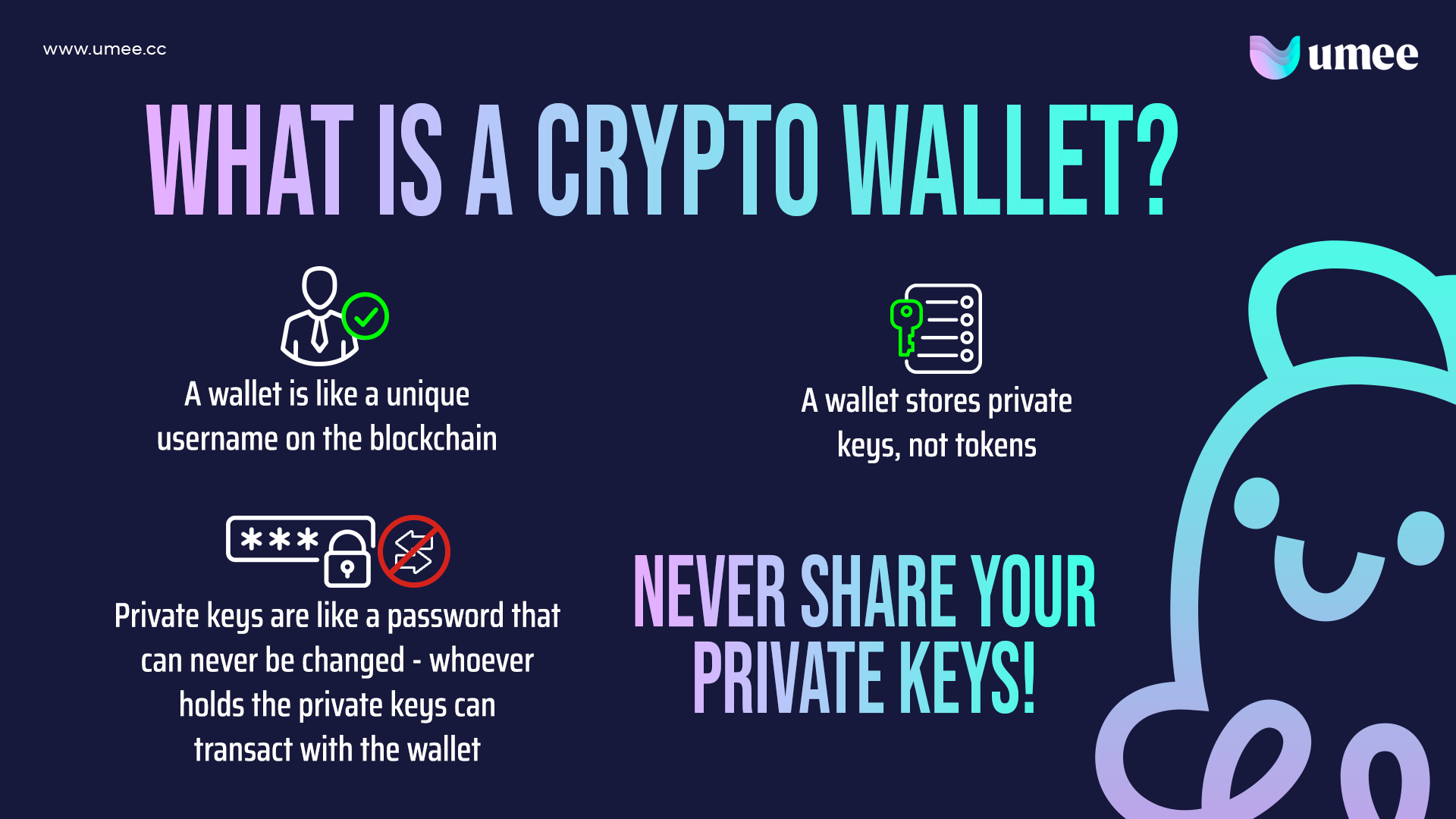 A crypto wallet is a tool that allows users to easily interact with blockchain-based applications. Interestingly, crypto wallets don’t actually store crypto, but rather the “private keys” required to approve crypto transactions on a blockchain. Crypto always remains on a blockchain regardless of who owns it or how it is used, and crypto wallets serve as an interface to let a user interact with the crypto associated with his/her “wallet address.”